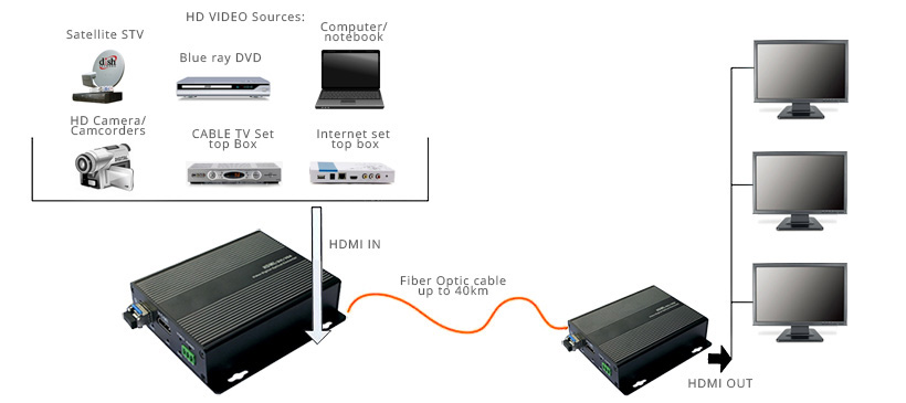 Video Optic Transmission System could transmit uncompressed and high definition HDMI video and audio signal over one 1-core fiber up to 100Km. It’s with Lesser attenuation, wide bandwidth, high anti-interference and safety performance, small size and light weight.Our products have the incomparable